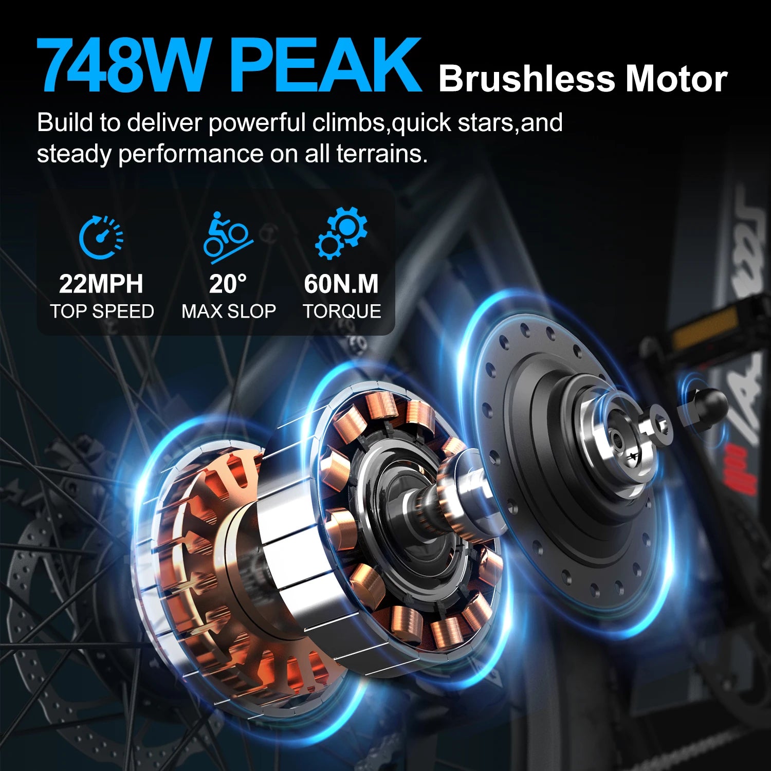Powered by a 500W motor paired with a 36V 13Ah lithium battery, this electric mountain bike achieves up to 22 MPH and delivers 60 N·m of torque, making climbs effortless and rides smooth. The full suspension system significantly reduces impact stress, increasing rider comfort during longer trips or rugged trail rides. With a load capacity of 330 lbs, the bike supports most riders comfortably while providing mechanical disc brakes for responsive stopping power in all conditions.