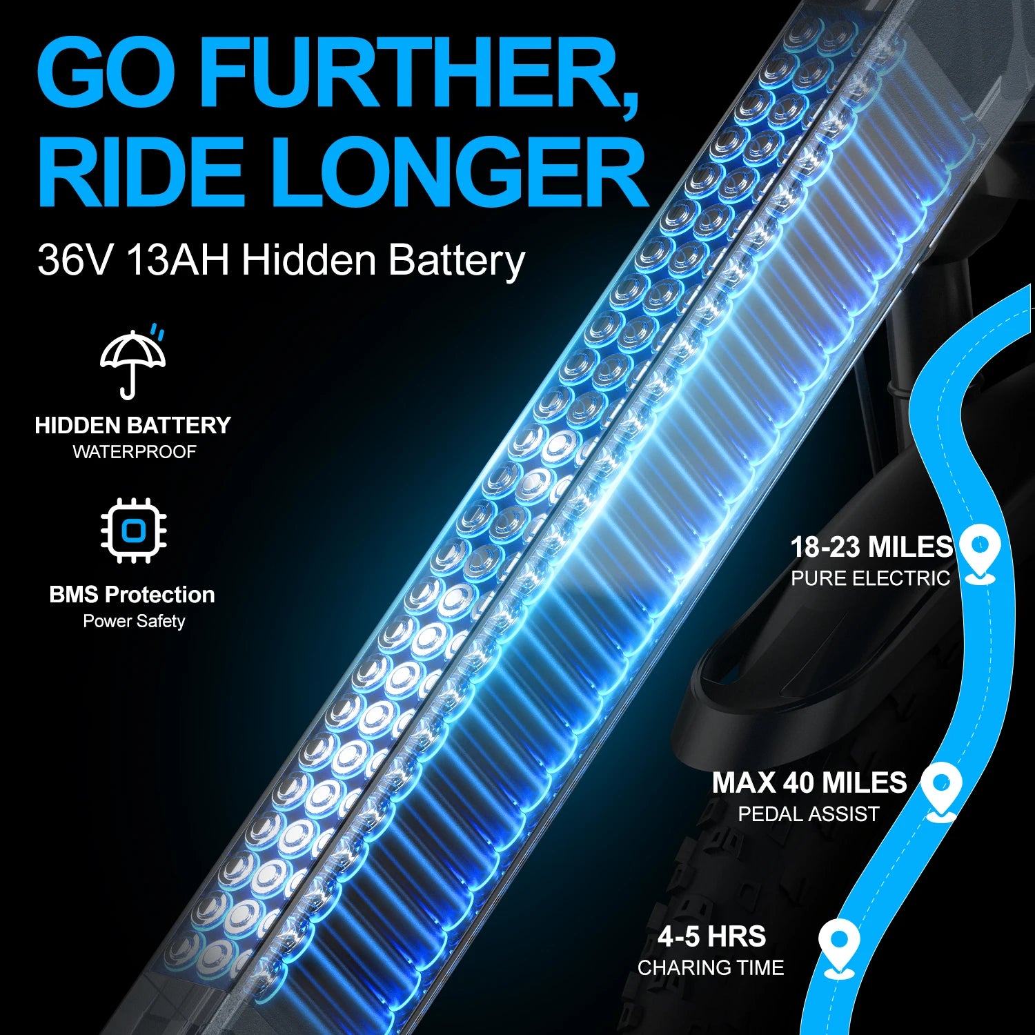 - 36V 13Ah lithium battery ensuring over 18 miles range on pure electric mode