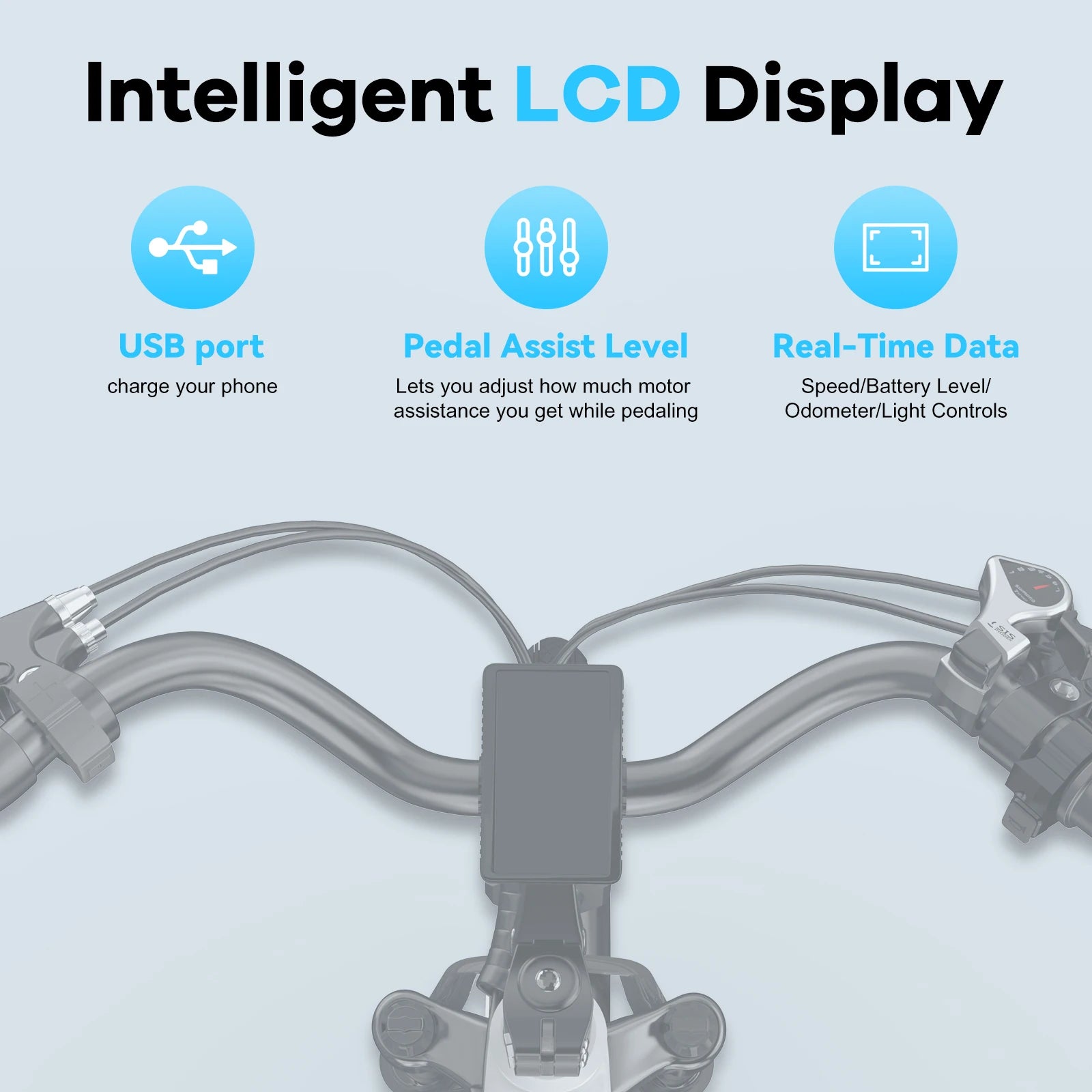 The color LCD display provides real-time information such as speed, battery level, pedal assist levels, and mileage. With five riding modes—including pure electric, pedal assist, and classic bike mode—and five adjustable pedal assist levels, riders can customize their experience for maximum comfort and efficiency. Plus, the easy-to-use cruise control function helps maintain steady speeds on longer rides.
